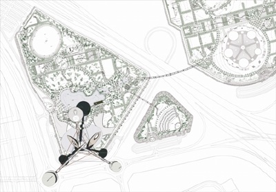 - Se plantea, en continuidad con el lago existente en el parque, unos mástiles que, partiendo de cota inferior, se elevan en voladizo sobre las calles circundantes para ir a encontrar los puntos que mejor vistas tenían sobre el puerto, la marina, el puente de Al Maktoum y el canal. En estos puntos de privilegio situados a 170 y 155 metros de altura se sitúa la cafetería y la parte VIP de la biblioteca.