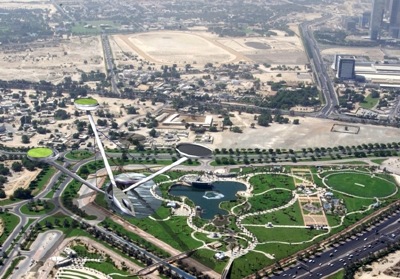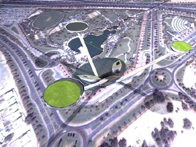 - Es planteja, en continuïtat amb el llac existent al parc, uns màstils que, partint de cota inferior, s'enlairen en voladís sobre els carrers circumdants per anar a trobar els punts que millor vistes tenien sobre el port, la marina, el pont d'Al Maktoum i el canal. En aquests punts de privilegi situats a 170 i 155 metres d'altura es situa la cafeteria i la part VIP de la biblioteca.