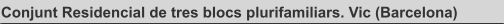 Superficie construida: 5.210,34 m2 Fecha proyecto: 1998 Localidad: Vic (Barcelona) Estado: Construido Descripción proyecto: -El proyecto se sitúa en una posición clave, actuando como bisagra entre el nuevo Vic emergente (encabezado por las facultades de la Universidad de Vic) y el Vic histórico y tradicional. Este emplazamiento aún resulta ser más privilegiado cuando en la fachada Sur (lateral) del proyecto da al gran parque “dels Estudis”, pulmón verde de la zona universitaria -Ante esta diversidad de situaciones el edificio responde con variedad de lenguajes, todos ellos religados por el mismo material de fachada, que actúa como elemento unificador: ladrillo macizo semimanual hidrofugado. Ciertos elementos, tales como voladizos y terrazas, resguardan el edificio del exceso de radiación solar en verano a la vez que la permiten en las épocas invernales. -La tipología de vivienda pasante proyectada permite tener ventilación cruzada natural en todas las viviendas. Los cortes verticales este-oeste entre bloques que se introducen, permiten que un gran número de pisos puedan captar luz natural por tres fachadas. Estos cortes, pues, independizan las escaleras consiguiendo bloques completamente aislados sólo unidos por la planta cuarta, diseñada a modo de puente colgado sobre el vacío.