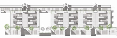 Superfície construïda: 5.210,34 m2 Data projecte: 1998 Localitat: Vic (Barcelona) Estat: Construït Descripció projecte: -El projecte es situa en un encreuament clau, actuant com a frontissa entre el nou Vic emergent (encapçalat per les facultats de la Universitat de Vic) i el Vic històric i tradicional. Aquest emplaçament encara resulta ser més privilegiat quan a la façana Sud (lateral) del projecte dóna al gran parc dels Estudis, pulmó verd de la zona universitària -Davant aquesta diversitat de situacions l'edifici respon amb varietat de llenguatges, tots ells relligats pel mateix material de façana, que actua com element unificador: totxo massís semimanual hidrofugat. Certs elements, tals com voladissos i terrasses, resguarden l'edifici de l'excés de radiació solar a l'estiu alhora que la permeten en les epòques hivernals. -La tipologia d'habitatge passant projectada permet tenir ventilació creuada natural en tots els habitatges. Els talls verticals est-oest entre blocs que s'introdueixen, permeten que un gran nombre de pisos puguin captar llum natural per tres façanes. Aquests talls, doncs, independitzen les escales aconseguint blocs completament aïllats tan sols relligats per la planta quarta, dissenyada a mode de pont penjat sobre el buit.