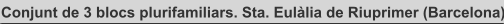 Superfície construïda: 8.328,60 m2 Data projecte: 2004-2006 Localitat: Santa Eulàlia de Riuprimer (Barcelona) Estat: Construït. Descripció projecte: Es planteja la construcció de 55 vivendes distribuïdes en tres blocs lineals en un emplaçament que té la singularitat de tenir totes les orientacions agradables, ja sigui per unes llargues vistes degudes a la posició topogràficament elevada de l’emplaçament, pel fet de tenir sortida a la gran zona exterior comunitària (amb piscina, sauna, gimnàs...) o bé per la singularitat de donar al carrer i a la plaça que tenen els edificis davant seu. Arquitectònicament el projecte busca una coherència formal a través del material, obra vista semimanual hidrofugada, malgrat les singularitats que cada bloc té. Un tractament especial mereix el bloc cantoner, perpendicular als dos primers, que resol la cantonada amb una singular xemeneia revestida d’acer cortén que esdevé el referent de tot el conjunt. Aquest bloc cantoner, a més, resol el desnivell topogràfic del carrer lateral amb una sola escala de comunitat i un sol ascensor mitjançant una audaç solució del bloc de comunicacions verticals.