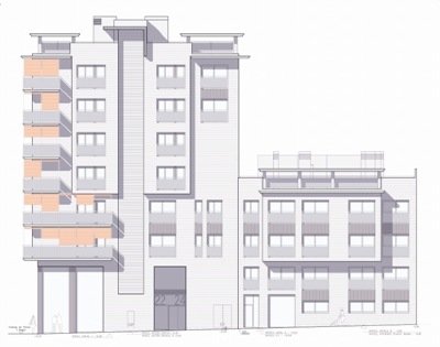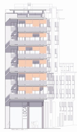 Superficie construida: 1.905,73 m2 Fecha proyecto: 2009 - actualidad Localidad: Barcelona (Barcelona) - Barrio de Sant Andreu. Estado: En fase de proyecto. Descripción proyecto: El proyecto está fuertemente influido por la normativa que rige cada una de los dos calles donde se ubica y que determina claramente su importancia. En el Paseo de Torres y Bages se permite una altura de PB, altillo y 6 alturas, mientras que en la calle lateral ésta se ve drásticamente reducida a baja, altillo y 2. Morfológicamente el edificio se intenta adaptar con naturalidad a esta diversidad y ajustar su lenguaje en función de a la calle donde da frente. Es patente el lenguaje más abstracto y colorista en el Paseo, con un espacio exterior intermedio a las viviendas como colchón con la ruidosa vía, que acaba materializando la esquina. A medida se va penetrando en la calle secundaria el lenguaje se va volviendo progresivamente más volumétrico y ordenado, dejando el color naranja de los "screens" de protección solar y permitiendo salir ya, plenamente, la piel que se ocultaba detrás suyo de obra vista esmaltada blanca.