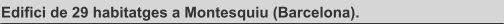 Superficie construida: 3.329,24 m2 Fecha proyecto: 2006 Localidad: Montesquiu (Barcelona) Estado: Construido. Descripción proyecto: El edificio de 29 viviendas y de planta rectangular se resuelve mediante dos escaleras y se proyecta para que las viviendas tengan una distribución práctica y funcional. En la fachada posterior (patio de manzana), soleada todo el día, el edificio se escalona consiguiendo unos espacios intermedios exterior-interior muy interesantes: porche, pérgola y terrazas que tamizan el paso de la luz solar, al tiempo que se consiguen unas viviendas con un importante complemento exterior, muy apreciado en la zona donde se ubica el edificio.