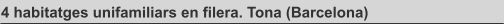 Superficieconstruida: 901,44 m2 Fechaproyecto: 2007 Localidad: Fontordera - Tona (Barcelona) Estado: En construcción. Descripciónproyecto: En un emplazamiento privilegiado, ante una zona verde y dando fachada al Paseo de Torras i Bages, se proyectan 4 viviendas unifamiliares en hilera. Aprovechando las magníficas vistas del emplazamiento se decide invertir la distribución habitual de esta tipología de vivienda y colocar el comedor, la sala de estar y la cocina en la planta segunda, en una gran sala diáfana y con dos generosas terrazas abiertas a las dos orientaciones. Además, este espacio se caracteriza por la estructura de madera de la cubierta, que aporta calidez y un punto diferenciador a este gran espacio único.