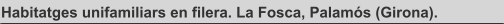Superficie construida: 1.590,00 m2 Fecha proyecto: 1985 Localidad: La Fosca - Palamós (Girona). Estado: Construidas. Descripción proyecto: Mediante un pequeño desfase en la posición de una vivienda respecto a la siguiente el proyecto intenta romper la frontalidad típica de estas construcciones, al tiempo que permite unas vistas en ángulo desde los porches exteriores de las viviendas.